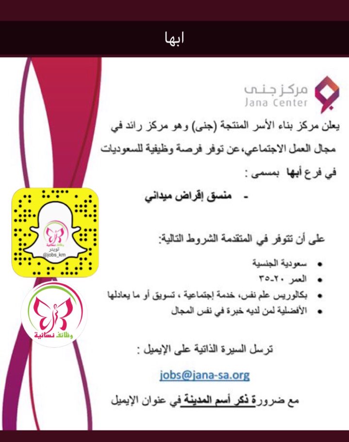 وظائف نسائية No Twitter وظائف نسائية في ابها يعلن مركز بناء الآسر المنتجة جنى وهو مركز رائد في مجال العمل الاجتماعي عن توفر فرصة وظيفية للسعوديات في فرع أبها بمسمى